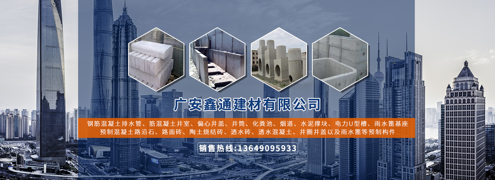 廣安鑫通建材有限公司是一家集研究、銷(xiāo)售:鋼筋混凝土排水管;筋混凝土井室、偏心井蓋、井筒;鋼筋混凝土化糞池、煙道、水泥撐塊;鋼筋混凝土電力U型槽、雨水篦基座;預(yù)制混凝土路沿石、路面磚;...